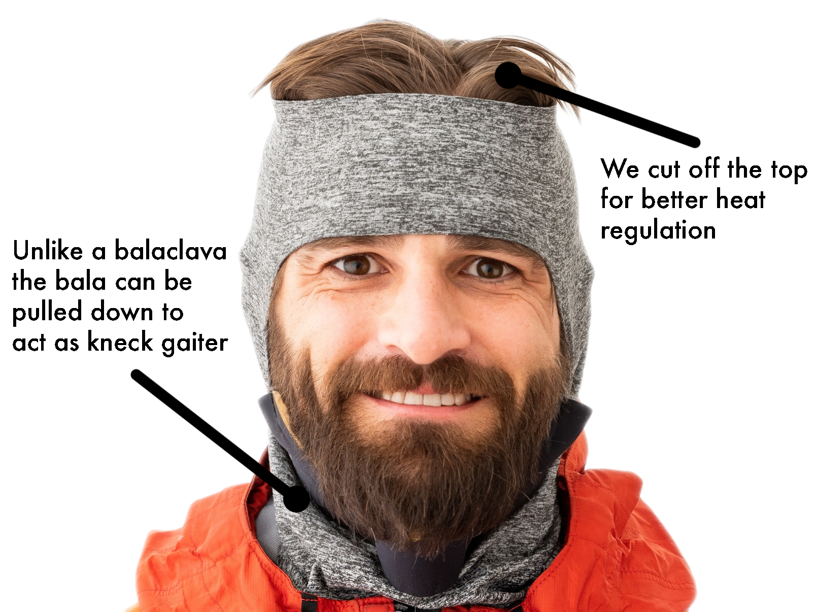 The bala's unique design provides the most versatile head covering on the market. We opened the top to regulate heat, and fit better than a neck-gaiter. The other benefit to opening the top is that unlike a balaclava the bala can be pulled down to protect just your neck or chin.
